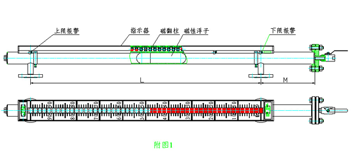 結(jié)構(gòu)原理 液位計(jì)根據(jù)浮子原理和磁性耦合作用研制而成。當(dāng)被測容器中的液位升降時(shí),液位計(jì)主導(dǎo)管中的浮子也隨之升降,浮子內(nèi)的永久磁鋼通過磁耦合傳遞到現(xiàn)場指示器,驅(qū)動(dòng)紅、白翻柱翻轉(zhuǎn) 180 °,當(dāng)液位上升時(shí),翻柱由白色轉(zhuǎn)為紅色,當(dāng)液位下降時(shí),翻柱由紅色轉(zhuǎn)為白色,指示器的紅、白界位處為容器內(nèi)介質(zhì)液位的實(shí)際調(diào)高度,從而實(shí)現(xiàn)液位的指示。